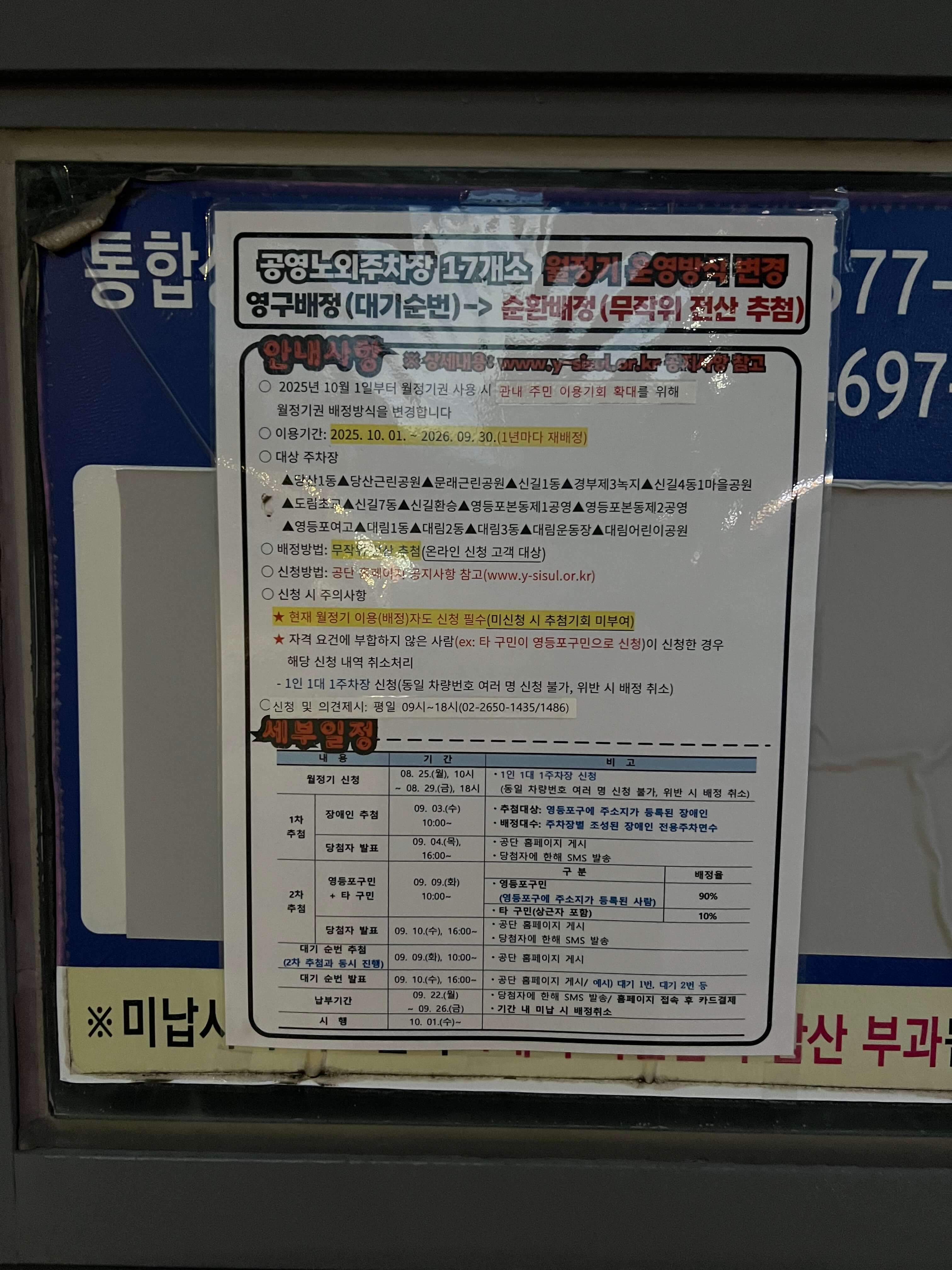신길환승공영주차장은 월주차도 운영하고 있는데 요금은 위 주차 요금 및 할인 정보 확인해 보시면 되겠습니다. 더불어 2025년 10월 1일부터 신길역 근처 관내 주민의 월 주차 이용기회 확대를 위해 월 정기권에 대한 대기순번제 배정방식을 변경한다고 하니 상기 사진 확인하셔서 착오 없으시길 바라겠습니다.